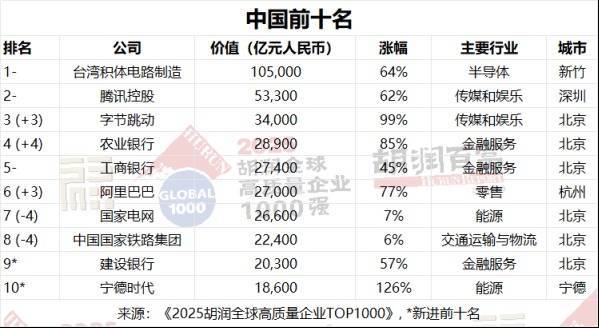 行业分布上,金融服务以249家上榜企业居首,能源(119家)、生命健康(73家)紧随其后。从盈利与收入维度看,沃尔玛以4.8万亿元年收入登顶,Alphabet以7900亿元净利润领跑,中国国家电网则以3.9万亿元年收入跻身全球收入前三。胡润集团董事长胡润分析认为,人工智能技术正成为重塑全球企业价值格局的核心变量。“现在榜单上有11家万亿美元企业,2020年仅有4家;前10名企业总价值从2020年的69万亿元增至184万亿元,接近A股和港股市值总和。”他表示,AI价值已在算力、软件、消费电子等领域全面释放,英伟达、台积电等算力企业,微软、Alphabet等软件巨头均成最大受益者。值得注意的是,千强企业中10%为非上市公司,OpenAI、字节跳动、SpaceX等成为全球最具价值的未上市企业代表。据悉,本次榜单主要以企业市值或估值为依据,并综合考量创新能力、可持续发展、社会责任、市场影响力等多维度指标。上市公司市值按照2025年11月14日的收盘价计算,非上市公司估值参照同行业上市公司或最新一轮融资情况进行估算。来源:大河财立方 版权归属原作者 如有侵权请联系删除责编:麻文静 审核:王世洋 终审:娄恒推荐阅读1.从胖东来到高校羽绒服热销:不是便宜就好,而是真诚才暖2.“救护车800公里收费2.8万元”事件最新进展:涉事医院被罚五千元3.莫斯科一学校突发持刀伤人事件4.小学老师咒骂全班得甲流,教育局回应