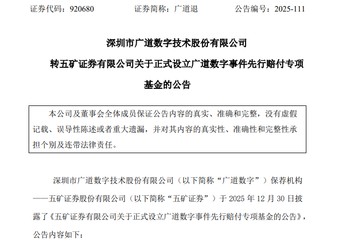 广道退于2025年12月30日公告显示,五矿证券已设立广道数字事件先行赔付专项基金,规模达2.1亿元,用于赔付适格投资者因公司信息披露违法违规遭受的投资损失。