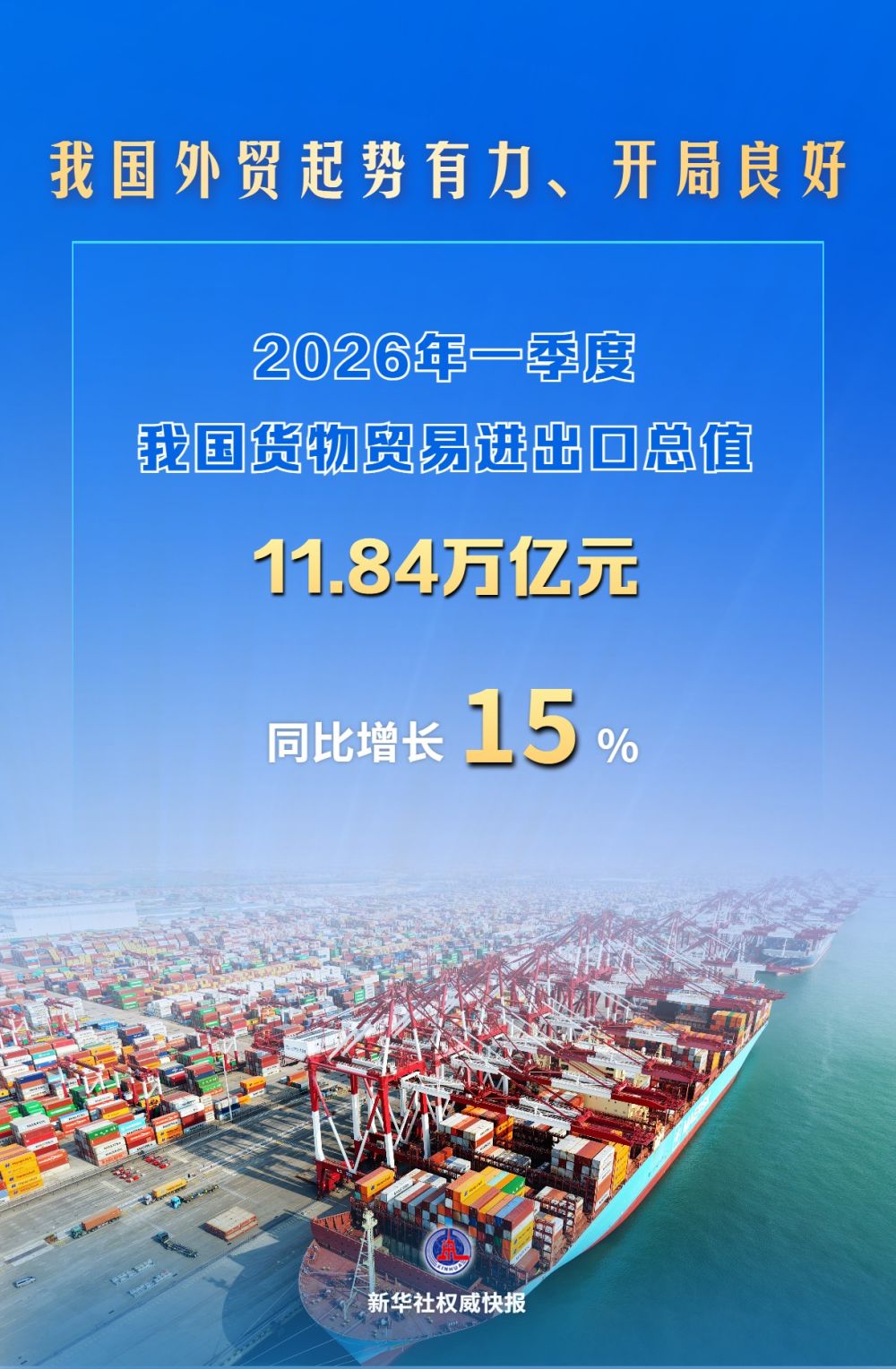 海关总署4月14日发布数据显示,2026年一季度我国货物贸易进出口总值11.84万亿元,历史同期首次超过11万亿元,同比增速保持两位数增长,达到15%。
