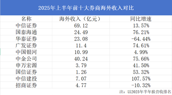 《每日财报》根据营收排名前十位的券商名单,梳理出各家海外营收数据。中金公司、国泰海通、广发证券等券商均在国际市场取得良好成绩,境外收入分别为40.24亿元、24.59亿元和11.40亿元,同比增速均超过70%。招商证券的海外收入为4.77亿元,同比下降10.32%,相比中金公司等券商还有不小差距。